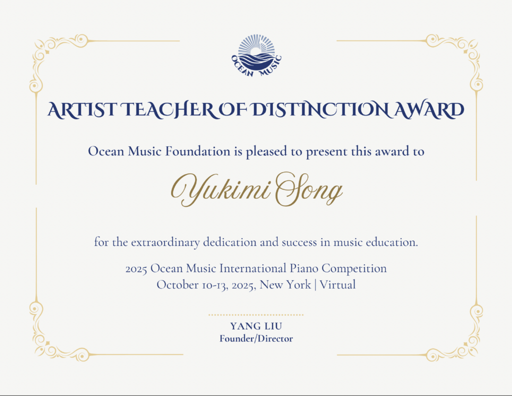 Beyond the stage, Yukimi is also a dedicated educator and mentor. As the founder of Yukimi Song Studio LLC, a multi-award-winning piano studio in Williamsburg, Brooklyn, she has nurtured generations of musicians. Her students have won numerous international competitions, attended elite summer programs, including the Vivace International Music Festival and the International Summer Academy at Mozarteum University. They have performed at renowned venues such as Carnegie Hall and Merkin Hall, composed and produced original works, and developed lasting connections to music. Her studio welcomes both young aspiring professionals and adults rediscovering music’s transformative power.